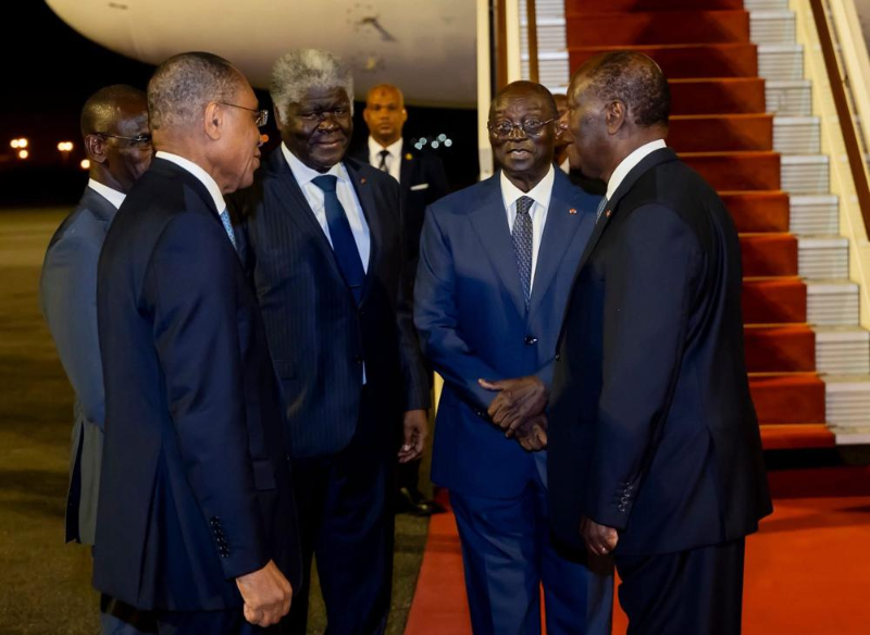 Le Président Alassane Ouattara, le Vice-Président Tiémoko Meyliet Koné et le Premier Robert Beugré Mambé à l'aéroport d'Abidjan.